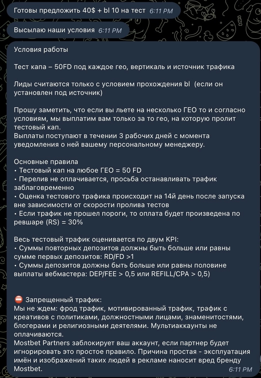 вот KPI и условия работы которые нам озвучил рекламодатель: