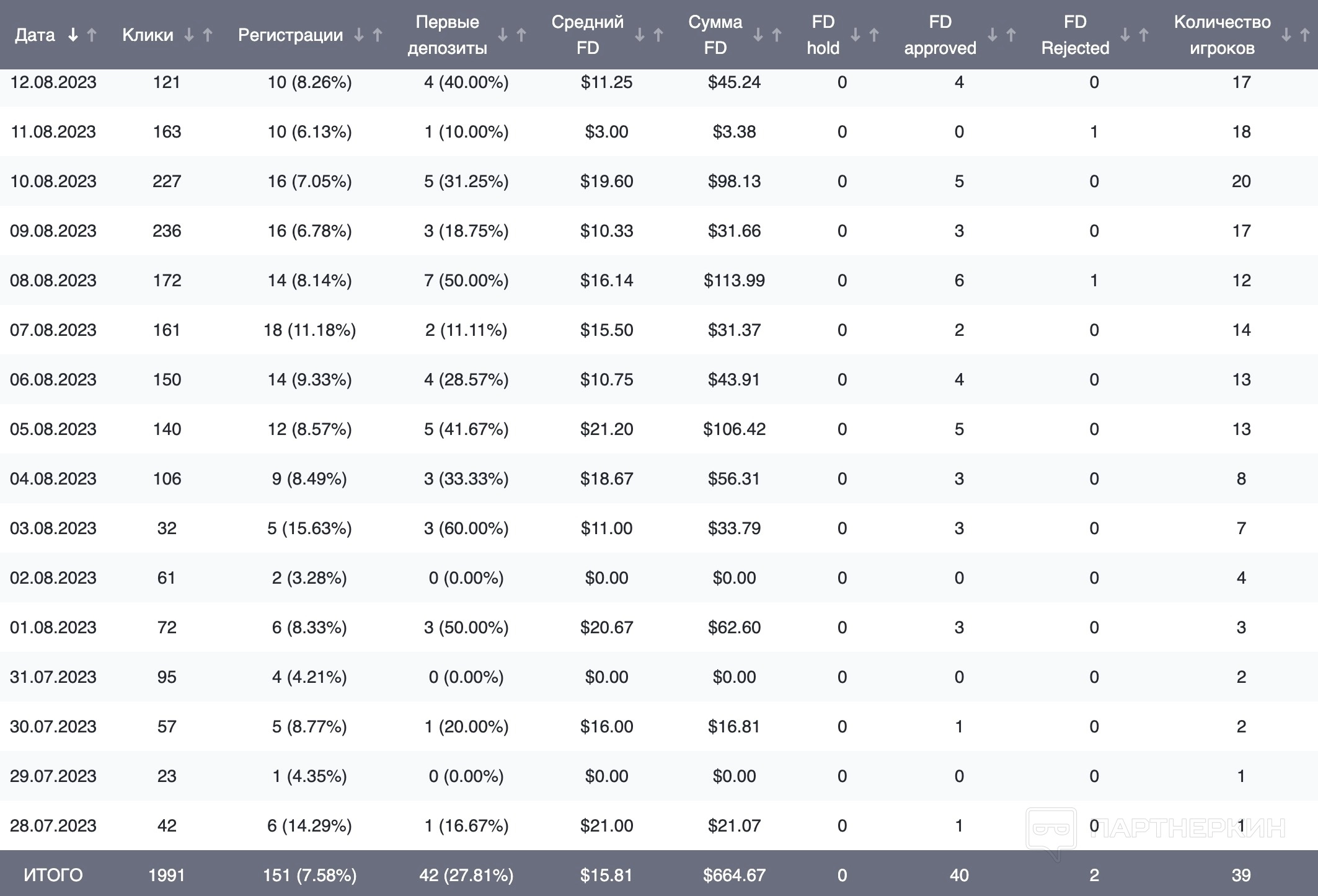 28 июля пришел первый fd, статистику по всему тест проливу прилагаю ниже: