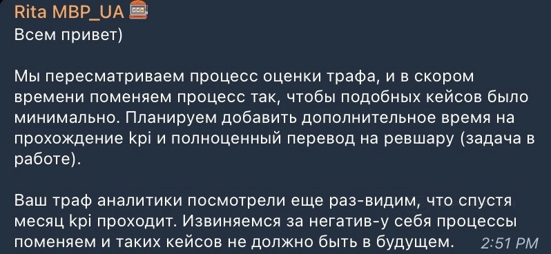 она постаралсь войти в нашу ситуацию, пересмотрела наш трафик сново спустя 5 дней, и вуа-ля, он уже прошел все показатели kpi!