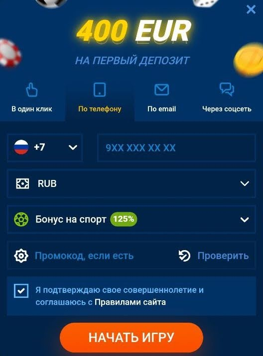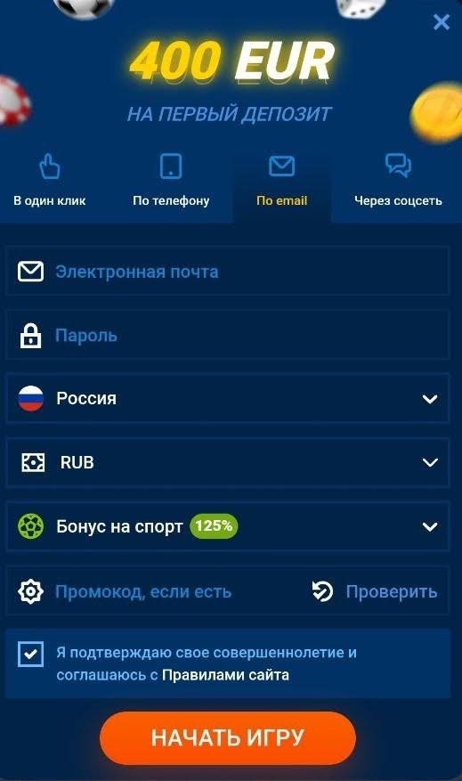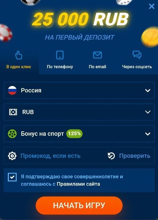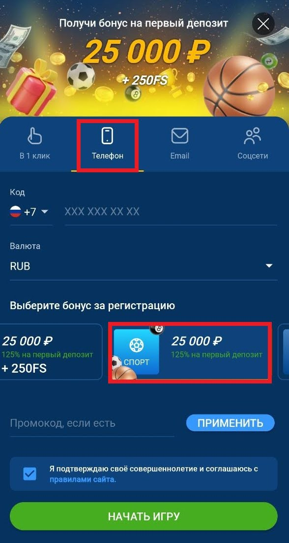 Вне зависимости от выбранного способа беттор подтверждает согласие с правилами БК, выбирает приветственный бонус (на спорт или для казино), а при наличии промокода вводит его в соответствующей строке.